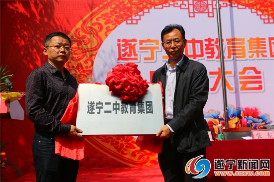 遂寧市教育局局長張永福為遂寧二中教育集團授牌,遂寧二中教育集團負(fù)責(zé)人張東接牌