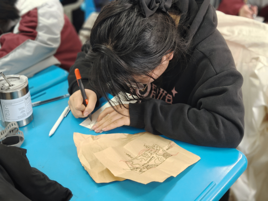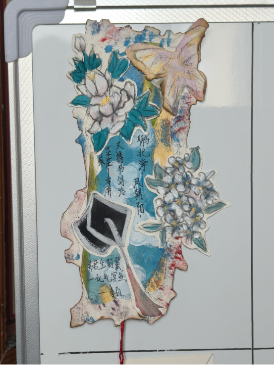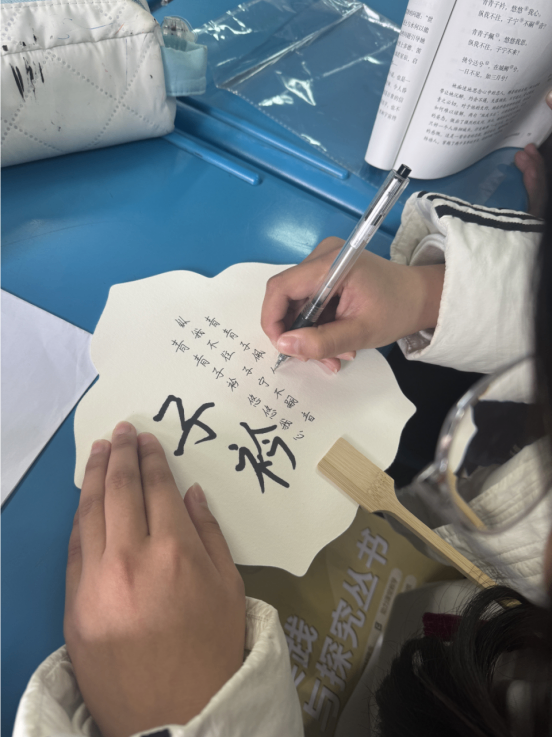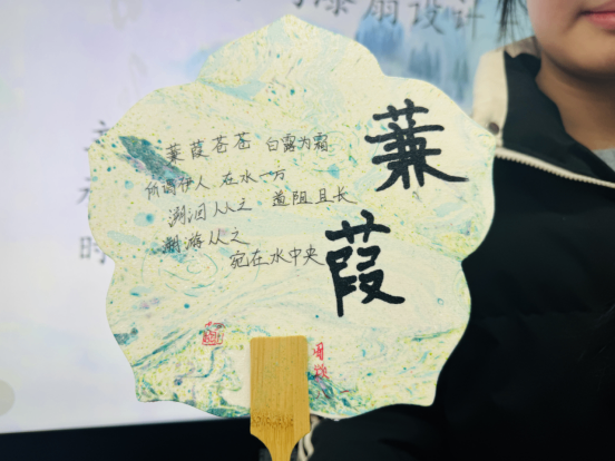 完成底色創(chuàng)作后,同學(xué)們再度提筆,在扇面上題詩作畫。有的以楷書謄抄《蒹葭》,致敬書法經(jīng)典;有的繪制寫意花鳥,展現(xiàn)“一花一世界”的哲思;更有創(chuàng)新者將流行文化與國風(fēng)元素融合,讓傳統(tǒng)扇面煥發(fā)青春活力。