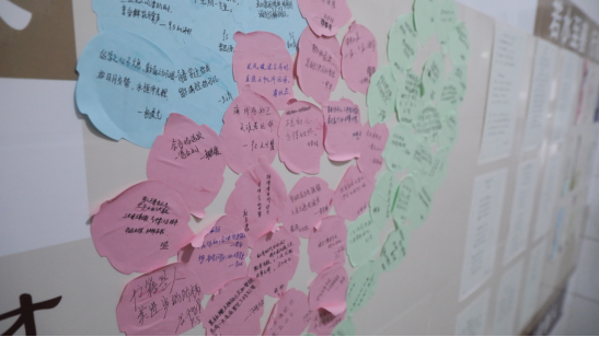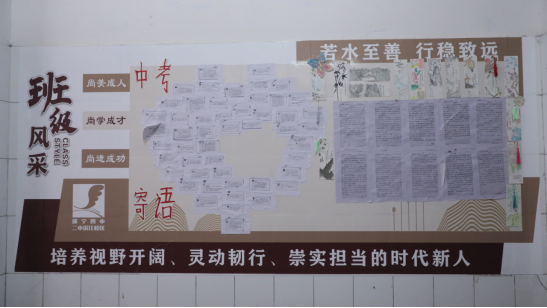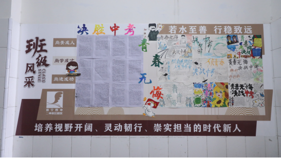 九年級的“青春無悔 決戰(zhàn)中考”主題文化墻,則充滿了勵志氛圍。目標(biāo)高中的圖片、激勵話語、中考倒計時牌以及同學(xué)們的學(xué)習(xí)計劃等內(nèi)容,時刻提醒著初三學(xué)子珍惜時光,努力拼搏。文化墻成為他們在備考路上相互鼓勵、奮勇向前的精神支柱,展現(xiàn)出他們?yōu)閴粝肴σ愿?、無悔青春的決心。