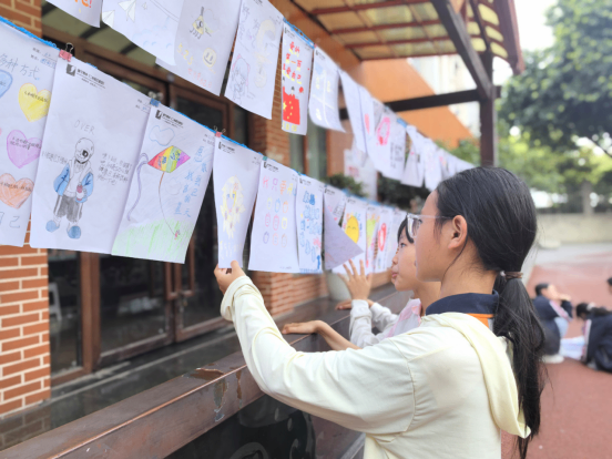 操場旁的"自我關懷知識展板"吸引眾多師生駐足,展板上"一分鐘肩頸放松操"、"情緒美食圖譜"等貼士搭配插畫,實用且趣味十足。