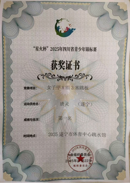 在全國比賽中,我校運動員同樣表現(xiàn)不俗。唐靈同學延續(xù)省賽的優(yōu)異表現(xiàn),在2025全國少年兒童跳水冠軍賽(B區(qū))女子少年組3米跳板項目中再獲第一名,并在全國跳水冠軍賽及世錦賽選拔賽中助力女子團體奪得冠軍,成為學校跳水項目的杰出代表。
