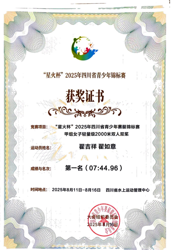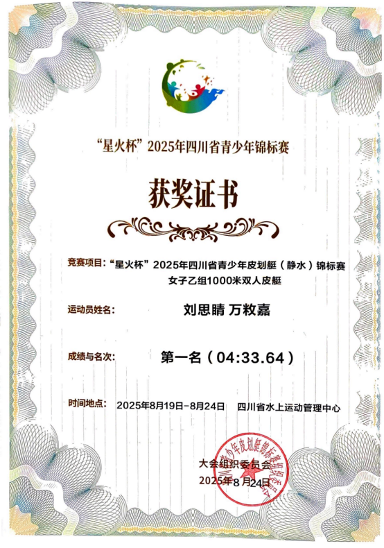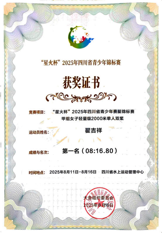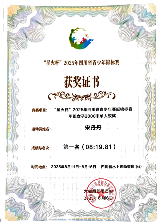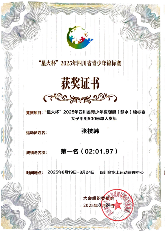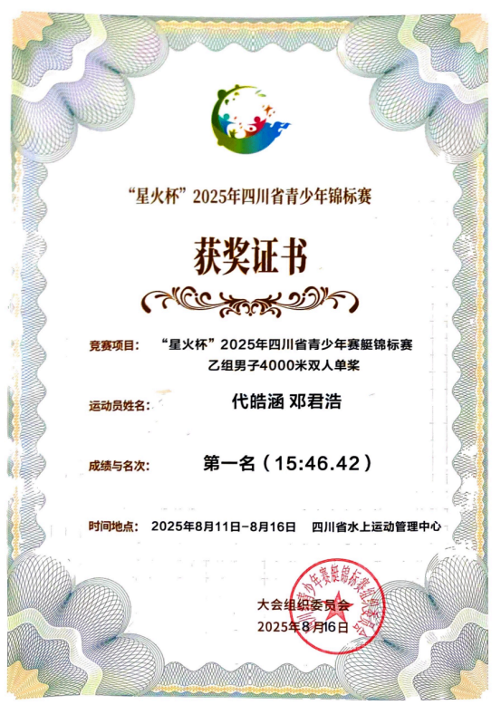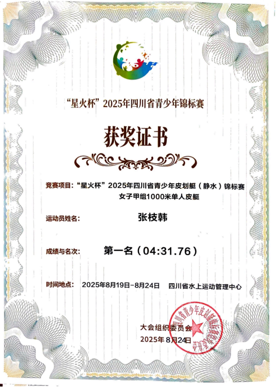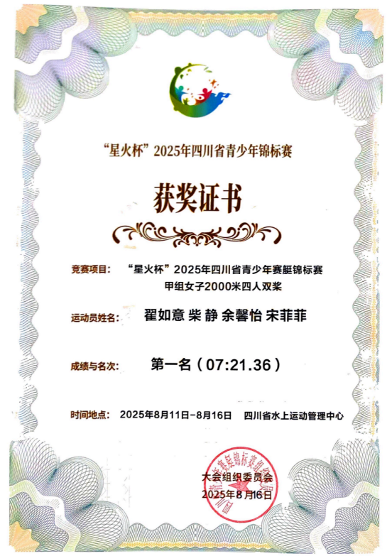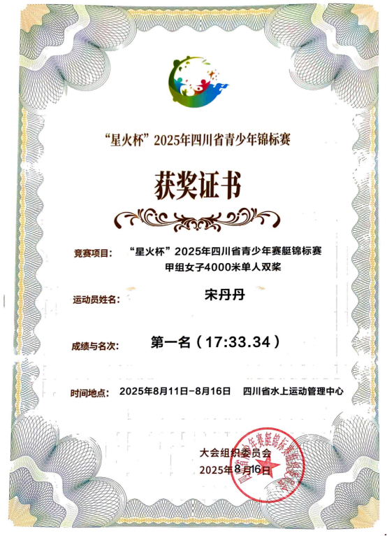 在四川省年度錦標賽中,我校學子表現(xiàn)尤為亮眼。初2024級4班唐靈同學在跳水女子甲A3米板項目中一舉奪魁,展現(xiàn)出了出色的技術水平和穩(wěn)定的心理素質(zhì);初2024級3班黎依玲同學在賽艇女子丙組2000米單人雙槳項目中勇奪第一,顯示出良好的體能和競技狀態(tài);初2023級3班劉思晴同學與隊友默契配合,榮獲女子乙組1000米雙人皮艇冠軍,體現(xiàn)了優(yōu)秀的團隊協(xié)作能力;初2023級7班代皓涵與3班鄧君浩同學在男子乙組4000米雙人單槳項目中協(xié)同作戰(zhàn),奪得冠軍,展現(xiàn)出頑強拼搏的體育精神。
