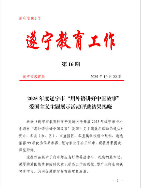 熱烈祝賀我校楊李梓文和楊舜淇?jī)晌煌瑢W(xué)在2025年度遂寧市“用外語(yǔ)講好中國(guó)故事”愛(ài)國(guó)主義主題展示活動(dòng)評(píng)選中喜獲二等獎(jiǎng)!